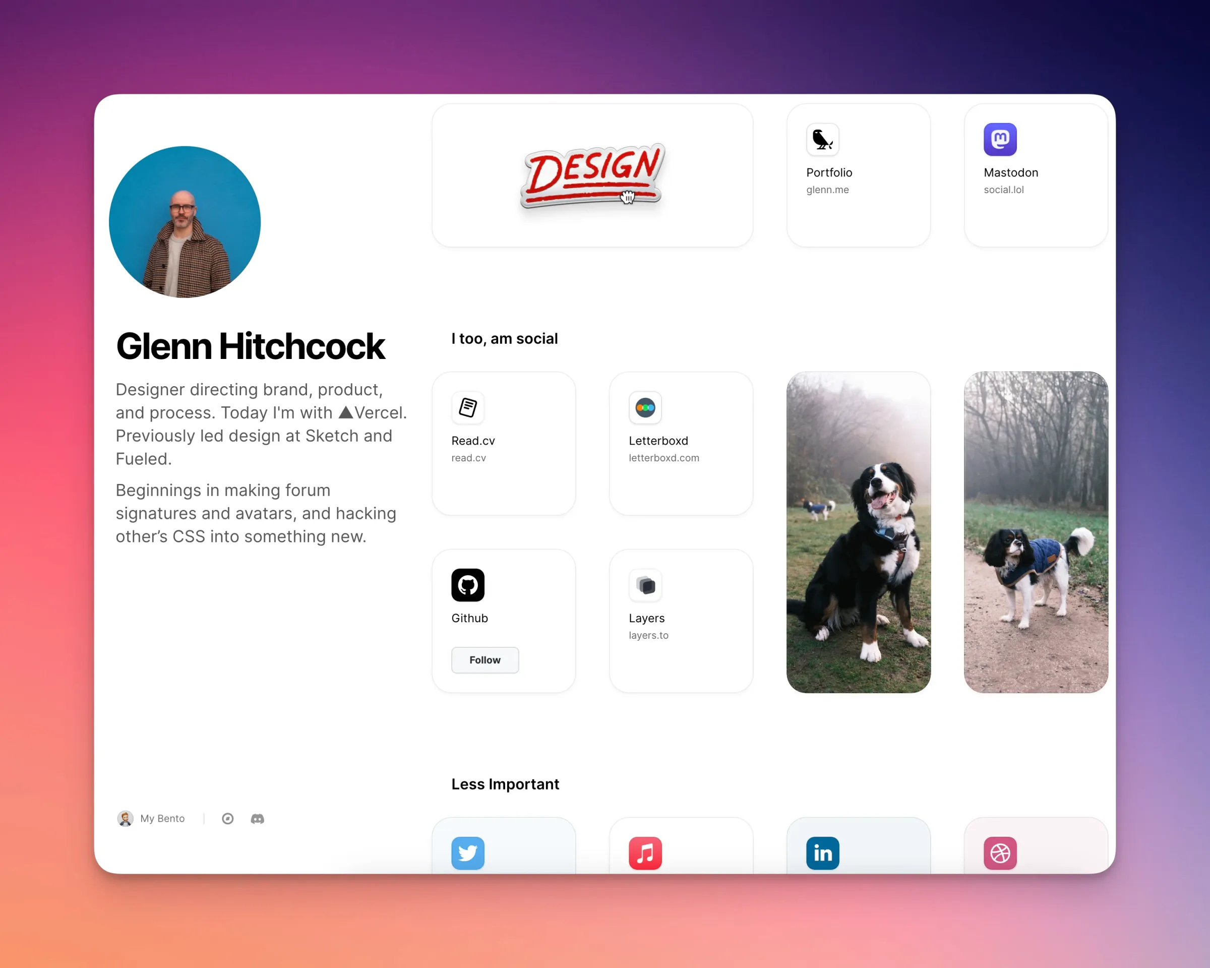 Страницы настраиваются и редактируются довольно просто, но сходу представить как видишь свою страничку сложно, именно поэтому Bento собрали наиболее популярные страницы пользователей на отдельной вкладке и вы можете вдохновится примерами работ других пользователей и взять чью либо раскладку за основу для своего "борда".